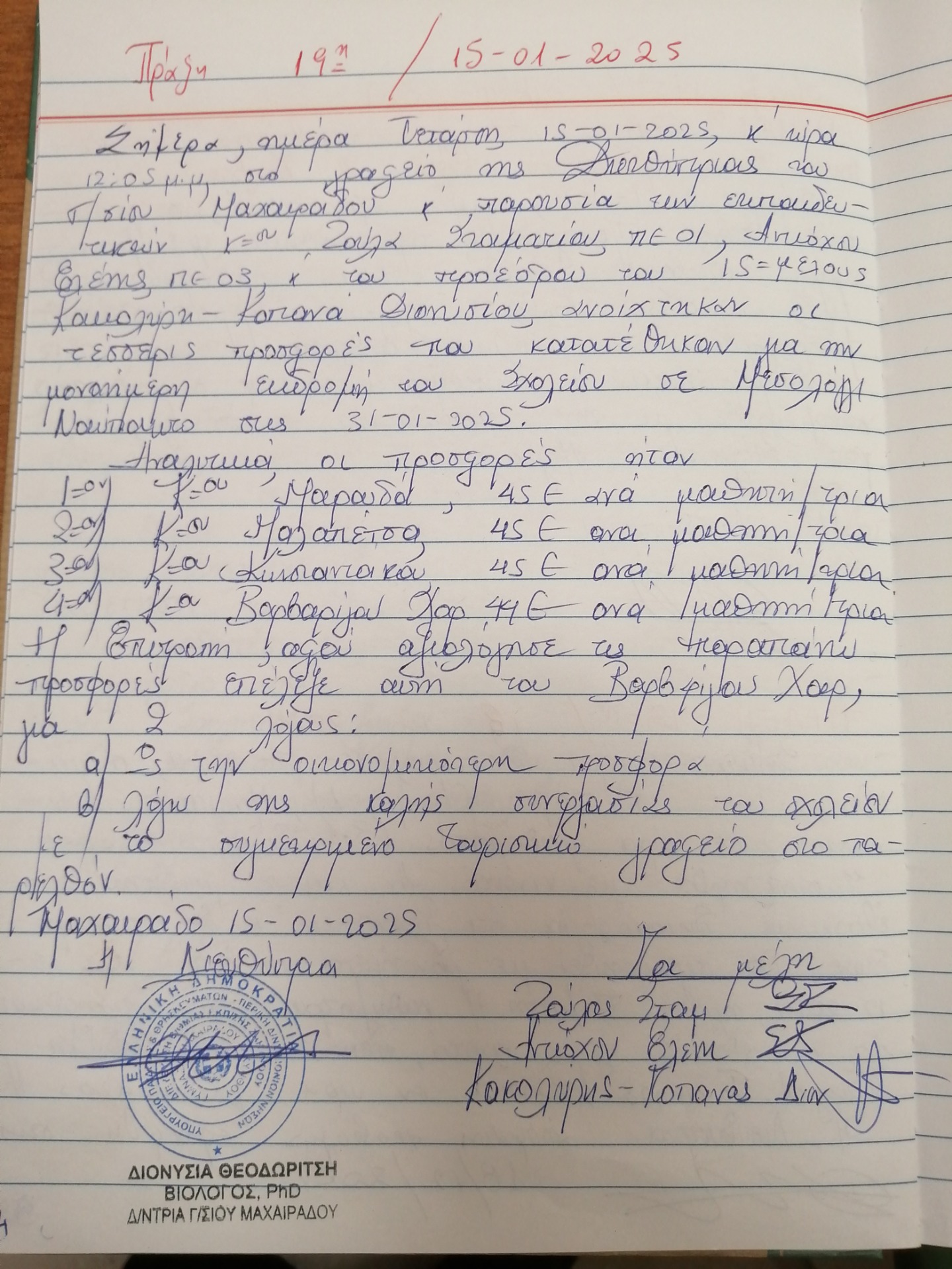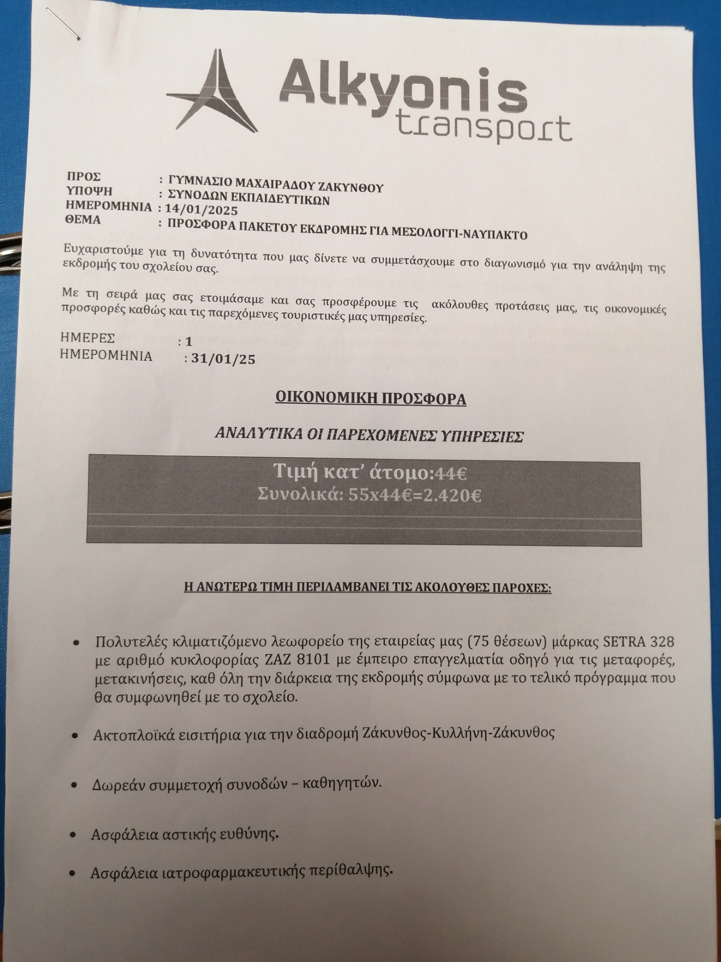 ''Με την υπ' αριθμό 39/26-02-2025 πράξη του Συλλόγου των Διδασκόντων του Γυμνασίου Μαχαιράδου Ζακύνθου εγκρίθηκε η πραγματοποίηση της τετραήμερης εκδρομής των μαθητών/τριών της Γ' Τάξης στο νησί των Φαιάκων. Η εκδρομή περιλαμβάνει 3 διανυκτερεύσεις. Θα γίνει στο διάστημα: από 20-03-2025 και ημέρα Πέμπτη έως και στις 23-03-2025 και ημέρα Κυριακή. Συμμετέχουν στην παραπάνω εκδρομή συνολικά 29 μαθητές/τριες της Γ' Τάξης. Το τουριστικό πρακτορείο που επιλέχθηκε μεταξύ των προσφορών, που κατατέθησαν, ήταν το ALKYONISTRANSPORT.. Το κόστος ανά μαθητή/τρια ορίστηκε σε 230,00 ευρώ. Η εκδρομή θα κοστίσει συνολικά 6.440,00 ευρώ. Τα χρήματα δόθηκαν στο ανάδοχο τουριστικό πρακτορείο σε 2 δόσεις. Συγκεκριμένα στις 06-03-2025 δόθηκε το ποσό των 2.800,00 ευρώ ως προκαταβολή και σήμερα, ημέρα Παρασκευή 14-03-2025, δόθηκε το ποσό των 3.640,00 ευρώ ως εξόφληση. Το πρόγραμμα της εκδρομής, οδηγίες και άλλες λεπτομέρειες, θα δοθούν στους Γονείς και Κηδεμόνες των μαθητών/τριών στην ενημερωτική συνάντηση με την κυρία Διευθύντρια του Σχολείου και τους συνοδούς Εκπαιδευτικούς, 3 τον αριθμό, αυτή την Τρίτη 18-03-2025, και στην αίθουσα εκδηλώσεων του Γυμνασίου Μαχαιράδου Ζακύνθου.